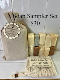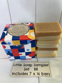 Includes seven different soaps, 1/4 bar each. In a cute, colourful box.